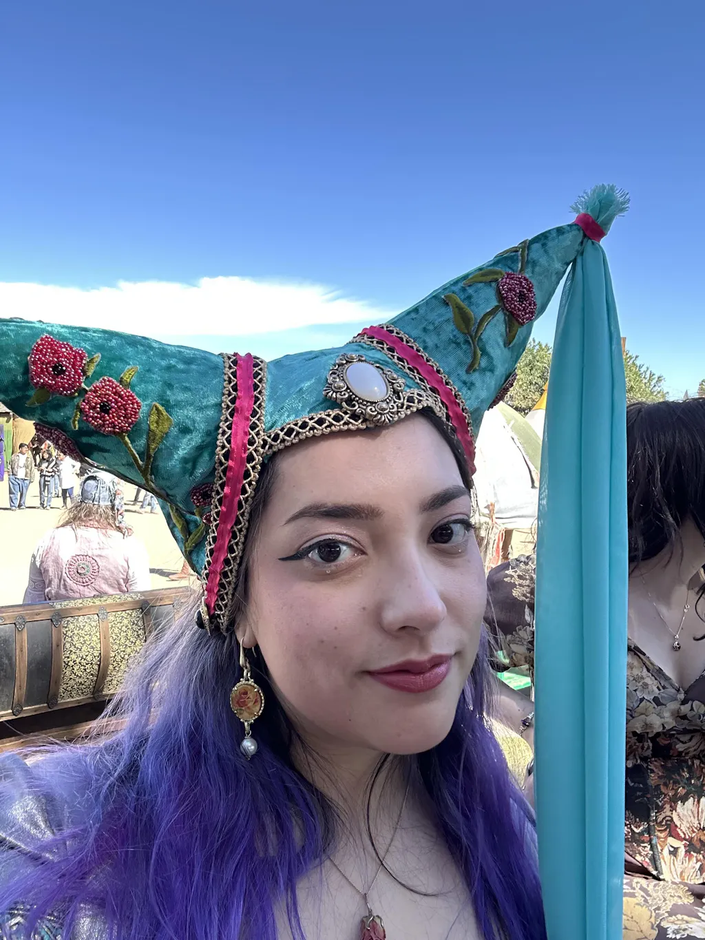 While I struggled with this pattern a bit, I did ultimately figure it all out and make a pretty fierce hat. One of my challenges was figuring out how to fold the felt squares. I honestly just had to fuck around for a while and eventually I figured out something that worked, but the instructions and photos didn’t help much. Partially, it would help if the photos of the hat part of the headpiece were of a lighter colored fabric so I could clearly see what that piece looks like folded up, but not yet trimmed. That’d really give an idea of how the hat piece was meant to come together. I also ended up making it about 1.5 inches larger all the way around than the original pattern piece to better fit and stay on my head. That meant I also had to cut the corner slits a lot longer. Anyway, as I said, I did manage to make a great hat and this pattern did give me a helpful jumping off point. Ultimately, I am a visual learner so I do often struggle with written instructions.